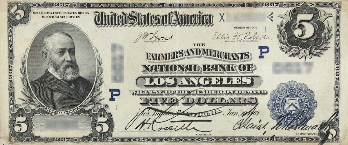A rare National Bank Note from Los Angeles, an item appraised by a professional California coin dealer.