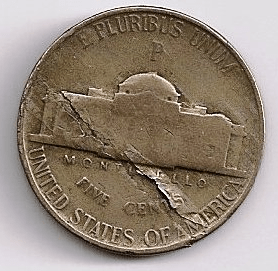 This is an example of a Jefferson Silver War Nickel with a Lamination Crack.